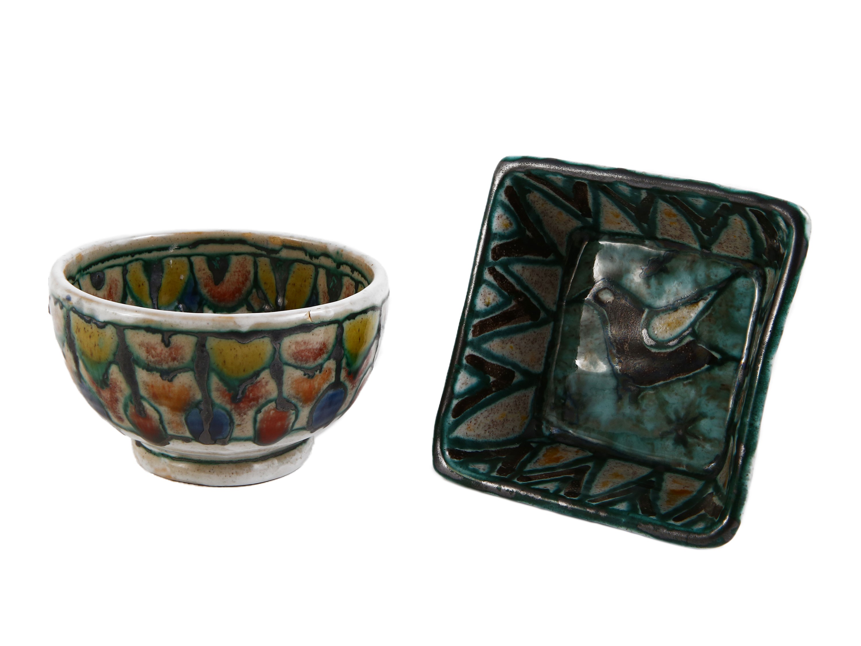 una di forma rotonda, l'altra squadrata e dipinta nei toni del verde e dell'ocra con figura di volatile