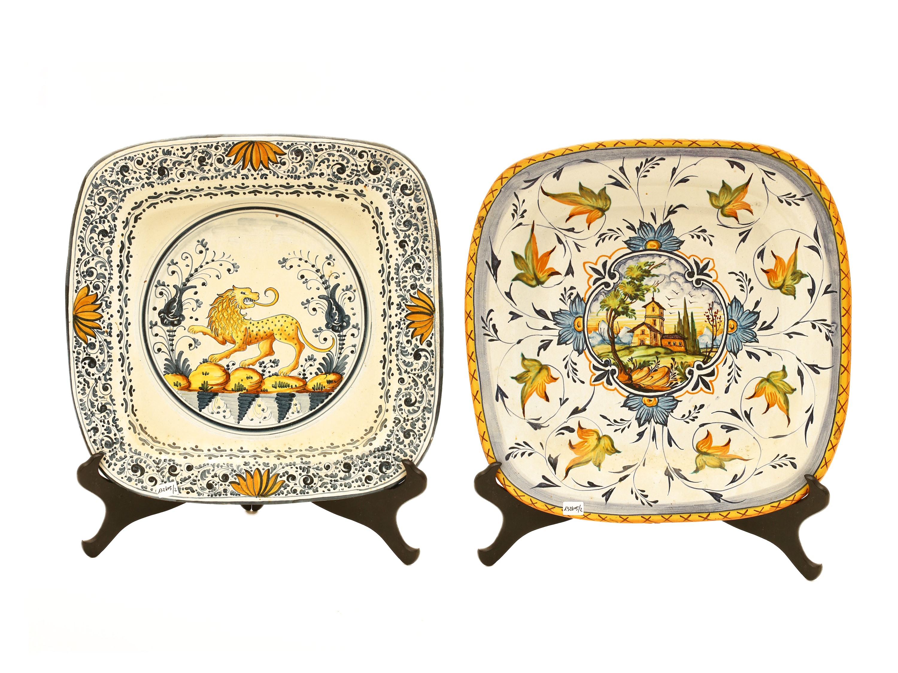 di forma quadrata, uno con tesa dipinta a girali e piccoli fiori nei toni del blu, fondo centrato da figura di leone, l'altra dipinta a motivi floreali, fondo dipinto a paesaggi