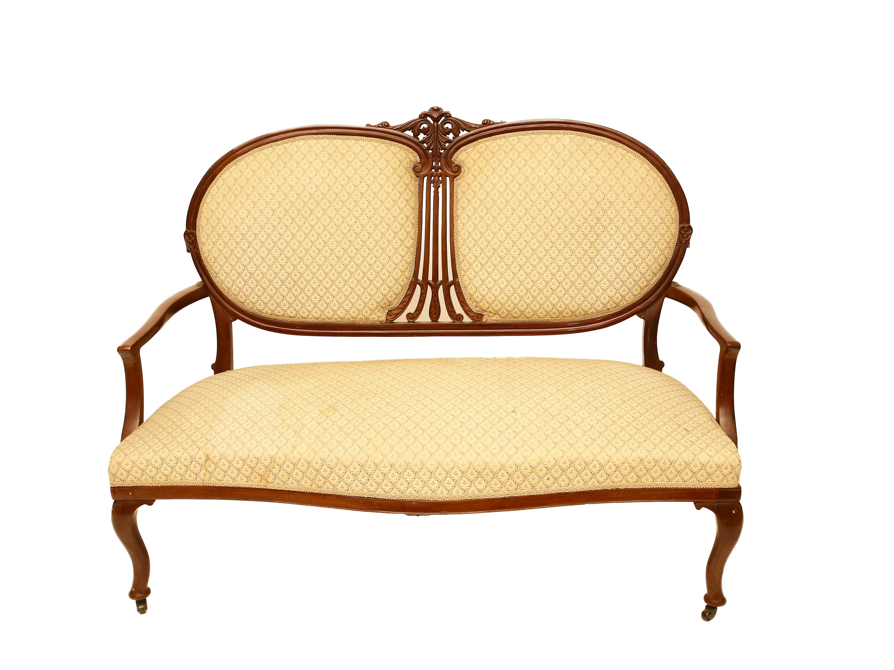 lungh cm 130 (3) inizio del XX secolo composto da divanetto con schienale a doppio ovale centrato da motivo a cancello intagliato con motivi floreali, braccioli a giorno, gambe anteriori mosse con piedini a ruota, imbottito e foderato in tessuto floreale, corredato di coppia di poltroncine en pendant