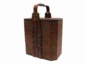 scatola h cm 22, diam cm 30 (10) entro scatola di forma globulare ricavata da una zucca, dipinta con motivi floreali [..]