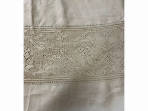 cm 225x165 ricamata a reticello con motivi geometrici e sfilature sui bordi, cifre ricamate, corredata di sei [..]