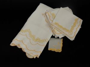 cm 132x118 bordi stondati e ricamati a filo giallo, corredata di dodici tovaglioli en pendant ed un centrino in [..]