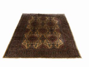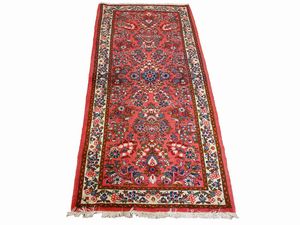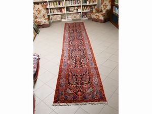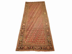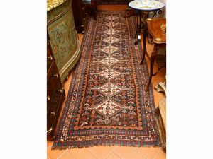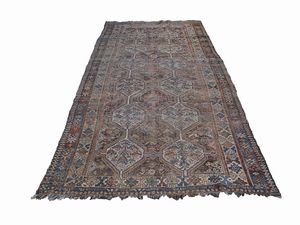 cm 462x185 a fondo blu, decorato con motivi geometrici nel tono del marrone, verde e giallo, difetti