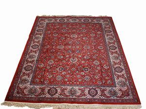 cm 280x260 bordura a motivi floreali nei toni del rosso su fondo blu, campo a piccoli fiori e animali su fondo [..]