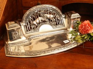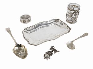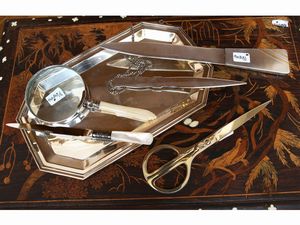 gr 340, vassoietto cm 26x16 (5) composto da un vassoietto portaposta in argento con tagliacarte a catenella, una [..]