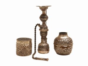 gr 355 (3) Asia composto da un componente per narghilè, una scatola cilindrica ed un vasetto globulare, tutti [..]