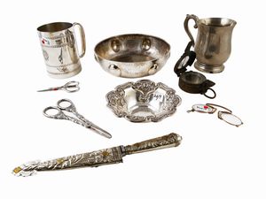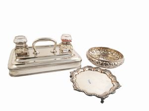 Lotto di accessori da scrivania in metallo argentato