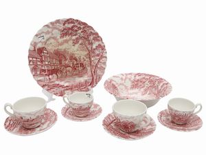 Inghilterra decorato a paesaggi in monocromia rosa, composto da 12 tazzine da caffe, 6 da te, una ciotola ed [..]