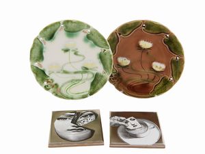cm 10x10, diam cm 17 (4) una coppia di piastrelle decorate con volti femminili ed una coppia di piccoli piatti [..]