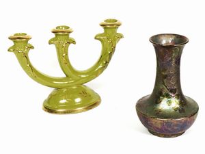 h cm 19 e cm 20 una base per lume realizzata come un candelabro a tre bracci in ceramica, Monina Gualdo Tadino, [..]