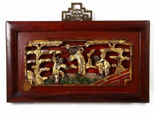 h cm 142 artigianato asiatico con applicazioni di tre figure in legno dorato, alcuni difetti