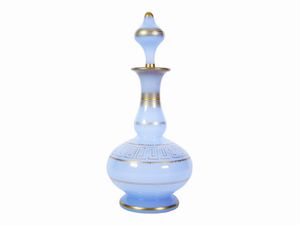 Piccola bottiglia in opaline bianca e azzurra lumeggiata in oro