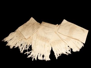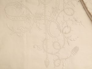 cm 272x196 e cm 80x46 circa ricamato a punto pieno con cifre, tralci e nappe,, corredato di federa en pendant, [..]