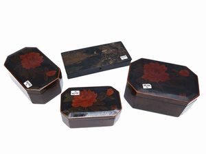 Cina una decorata con fiore di peonia che ne contiene atre due ed una con paesaggio e cavaliere