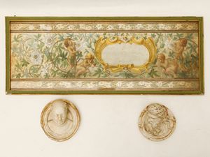 pannello cm 30x74; bassorilieri diam cm 13,5 fine del XIX/inizio del XX secolo composto da un pannello, tecnica [..]