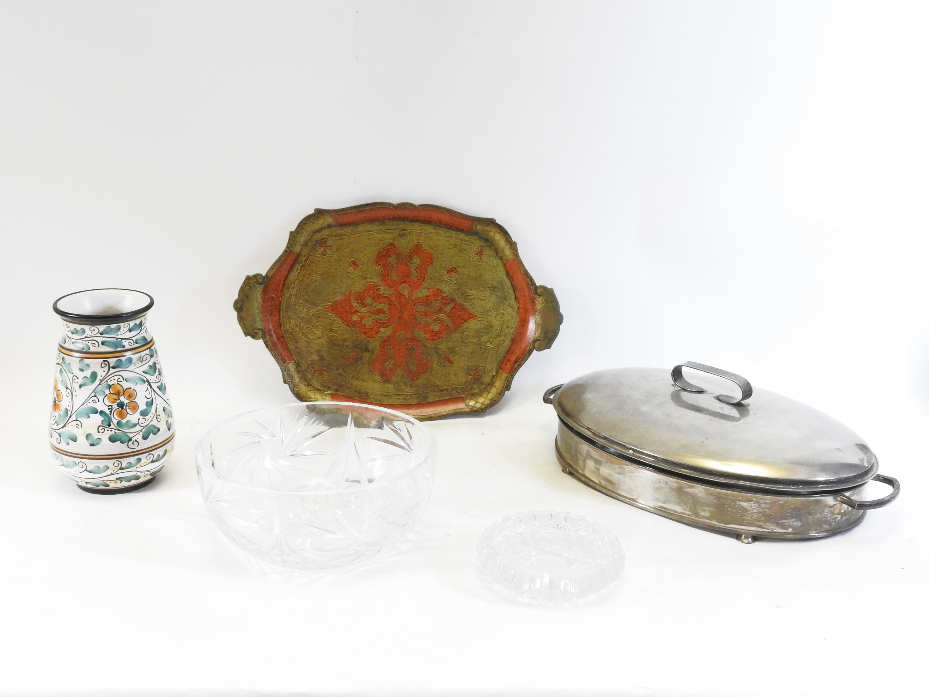 uno scaldavivande ovale in metallo argentato e vetro, un vaso in ceramica, una coppa ed un posacenere in cristallo molato, un vassoio in legno in stile fiorentino, alcuni difetti