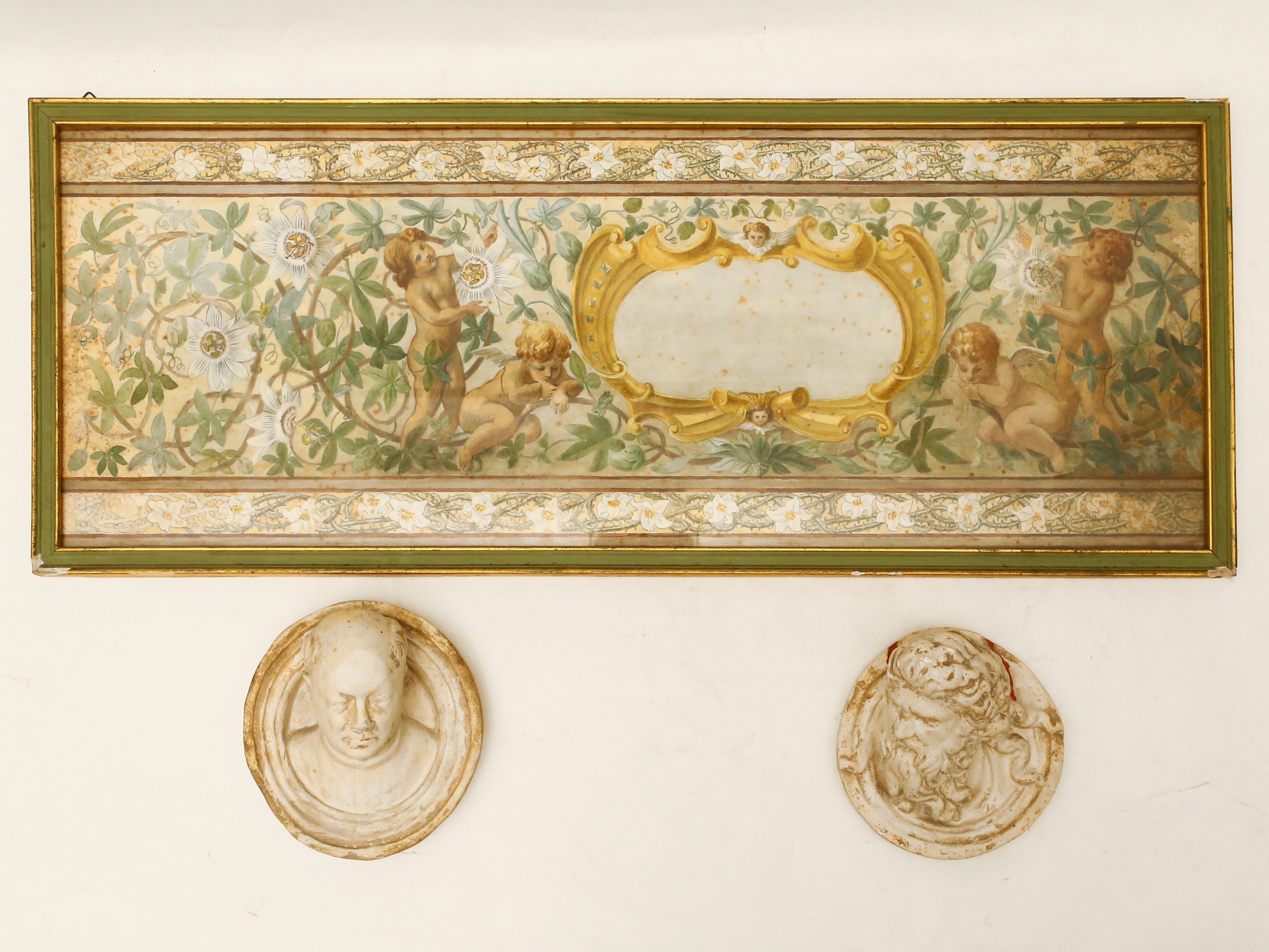 fine del XIX/inizio del XX secolo composto da un pannello, tecnica mista su carta, raffigurante teorie di putti, fiori e foglie e due bassorilievi in gesso raffiguranti figure maschili
