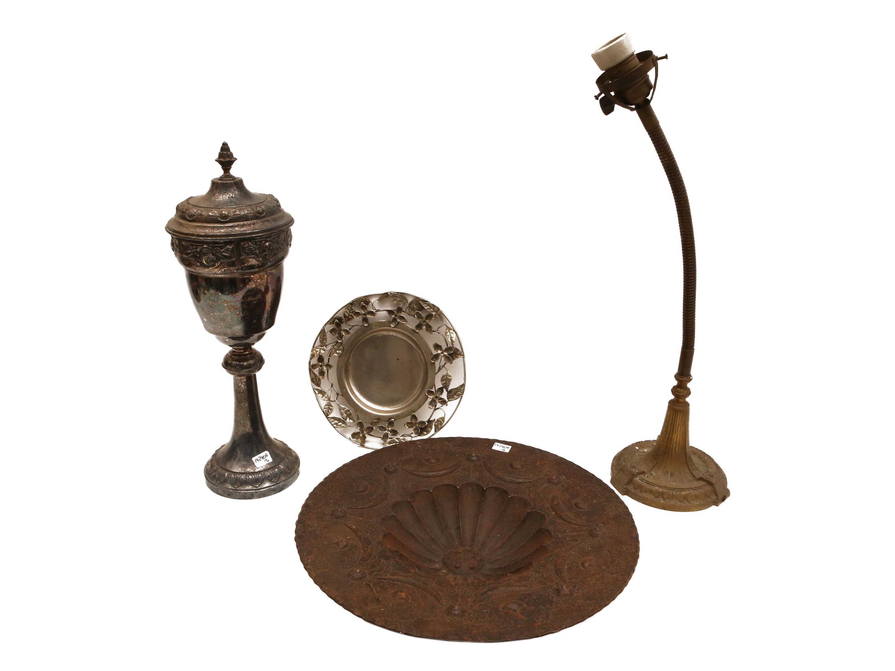 inizio del XX secolo composto da un lume con stelo a molla, un piatto baccellato in ferro, un piattino decorato con ghirlanda di foglie e una coppa con coperchio, difetti