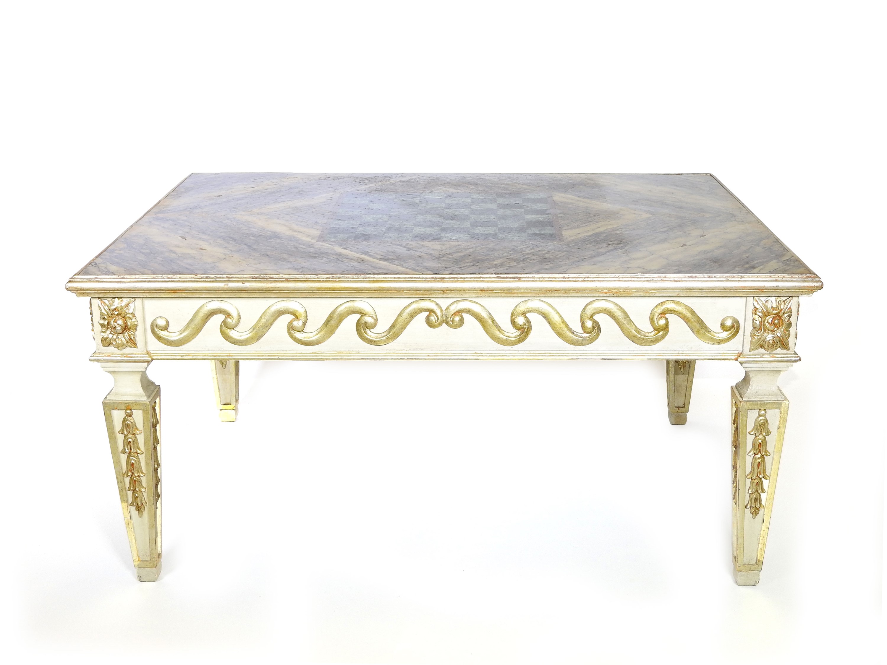 h cm 51x103x78 XVIII/XIX secolo montato su tavolo da centro in legno laccato e lumeggiato in oro realizzato in stile settecentesco, fascia intagliata con motivi a volute, gambe a faretra con intagli vegetali
