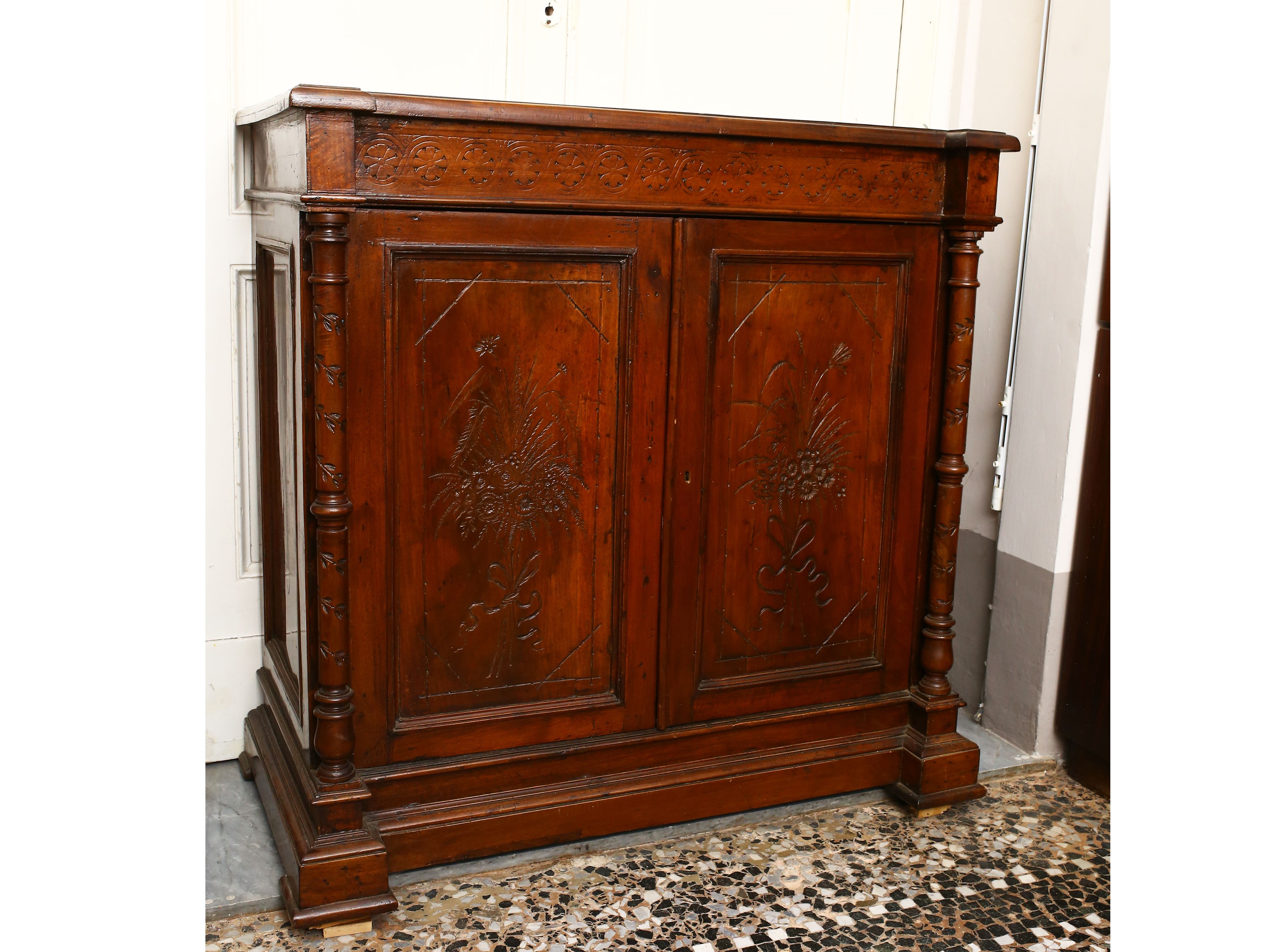 inizio del XX secolo fascia intagliata con motivo a rosoni, due sportelli sul fronte intagliati con motivi floreali, lesene a colonna intagliate con motivo vegetale a torchon, alcuni difetti