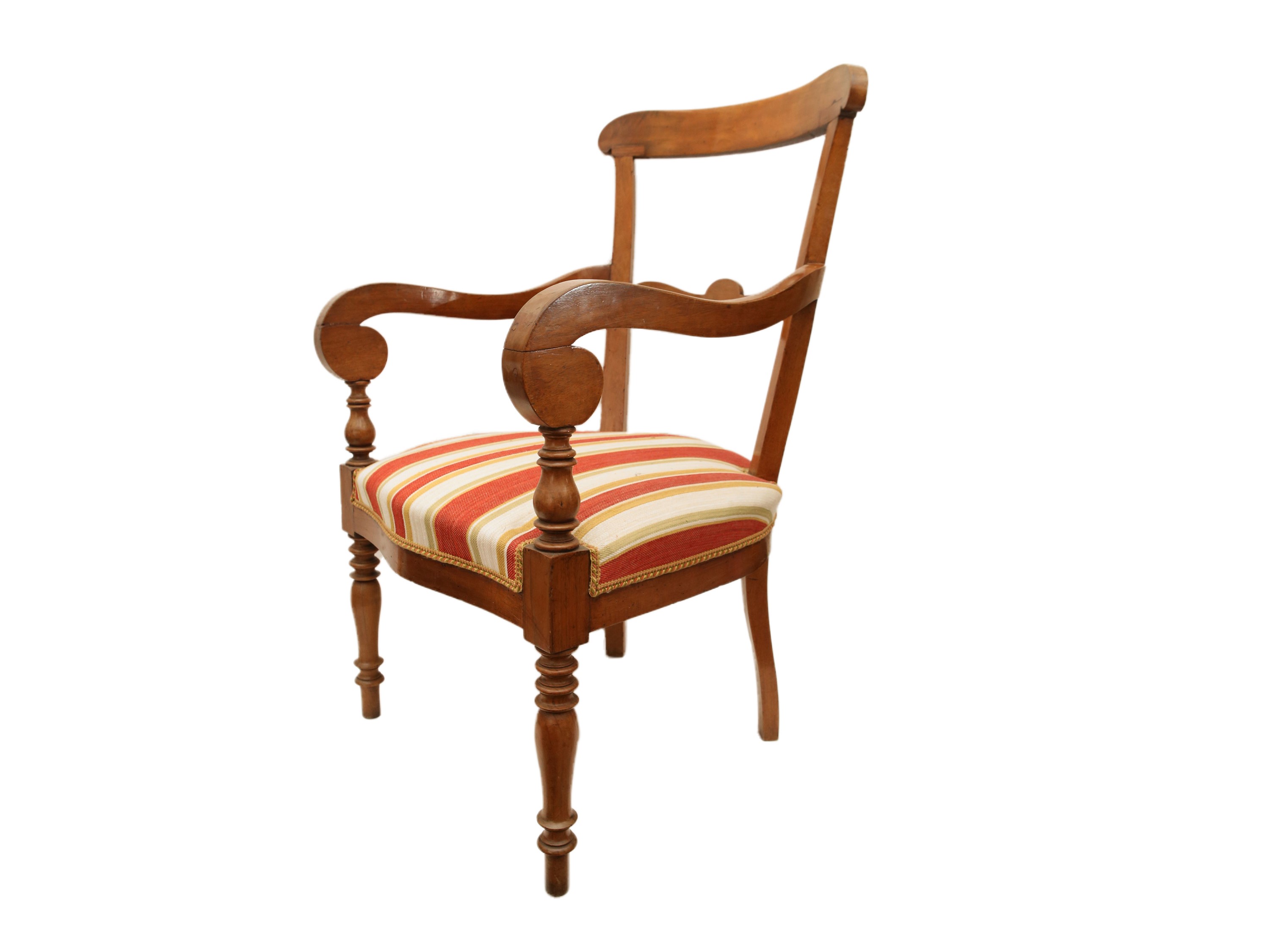 Toscana, prima metà del XIX secolo schienale con cartella sagomata, braccioli mossi desinenti a ricciolo, gambe tornite, seduta in tessuto rigato nei toni del beige e del bordeaux, alcuni restauri