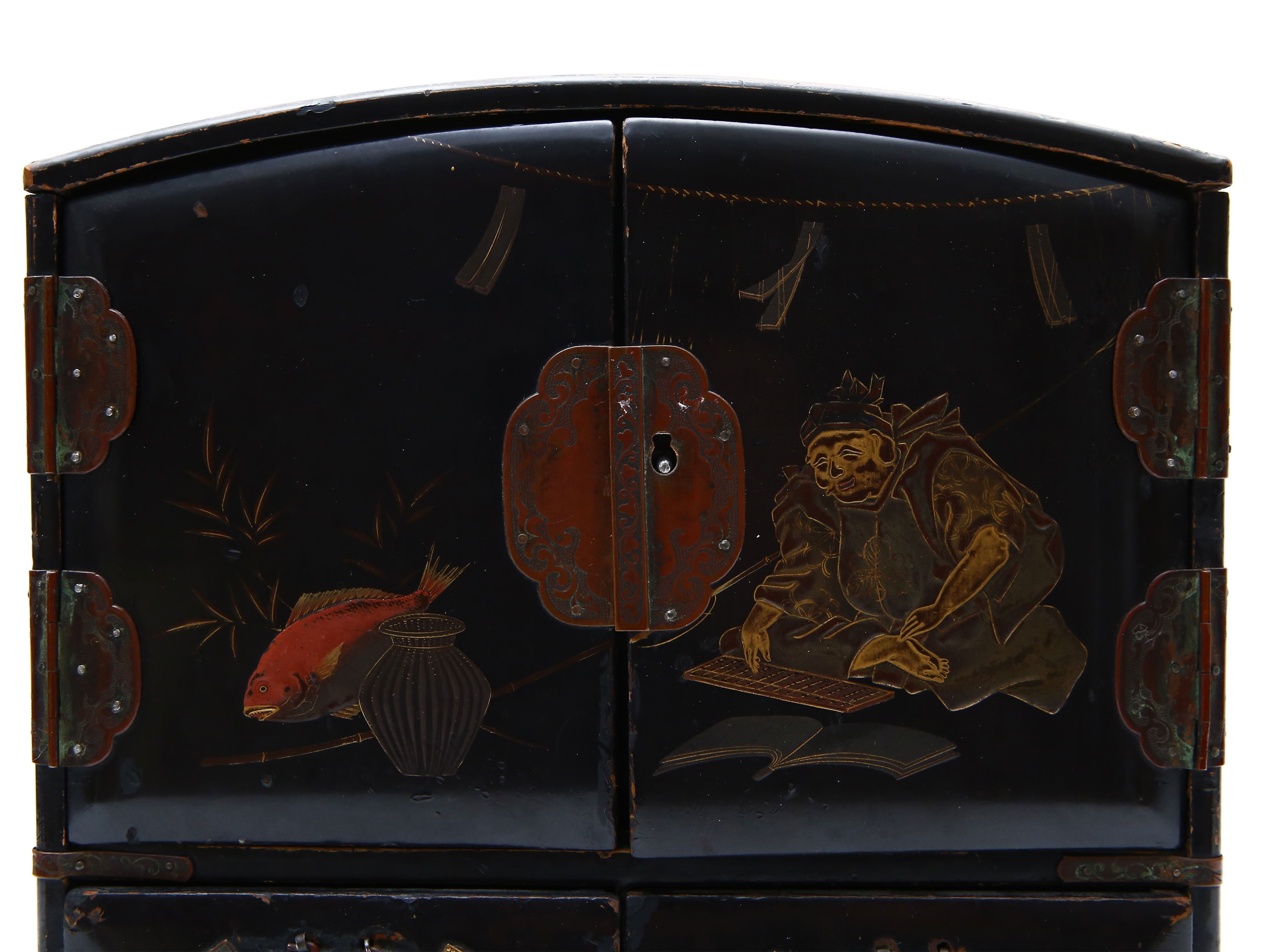 Cina, inizio del XX secolo realizzato come un secretaire in miniatura decorato con chinoiserie dorate, alcuni difetti