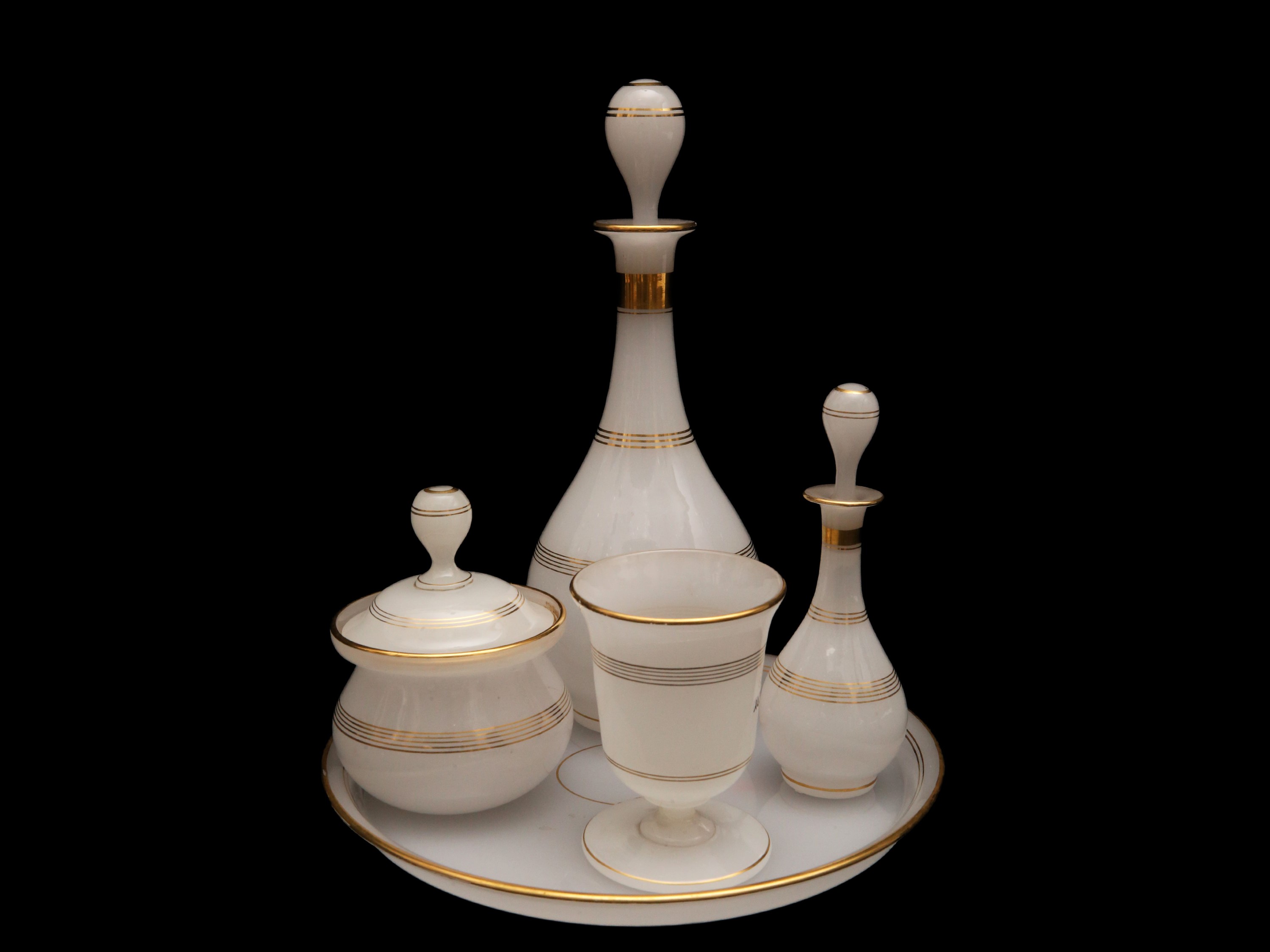 XIX secolo composto da bottiglia, bicchiere, ampolla, porta bon bon e vassoietto rotondo, lumeggiature in oro, alcuni difetti (5)