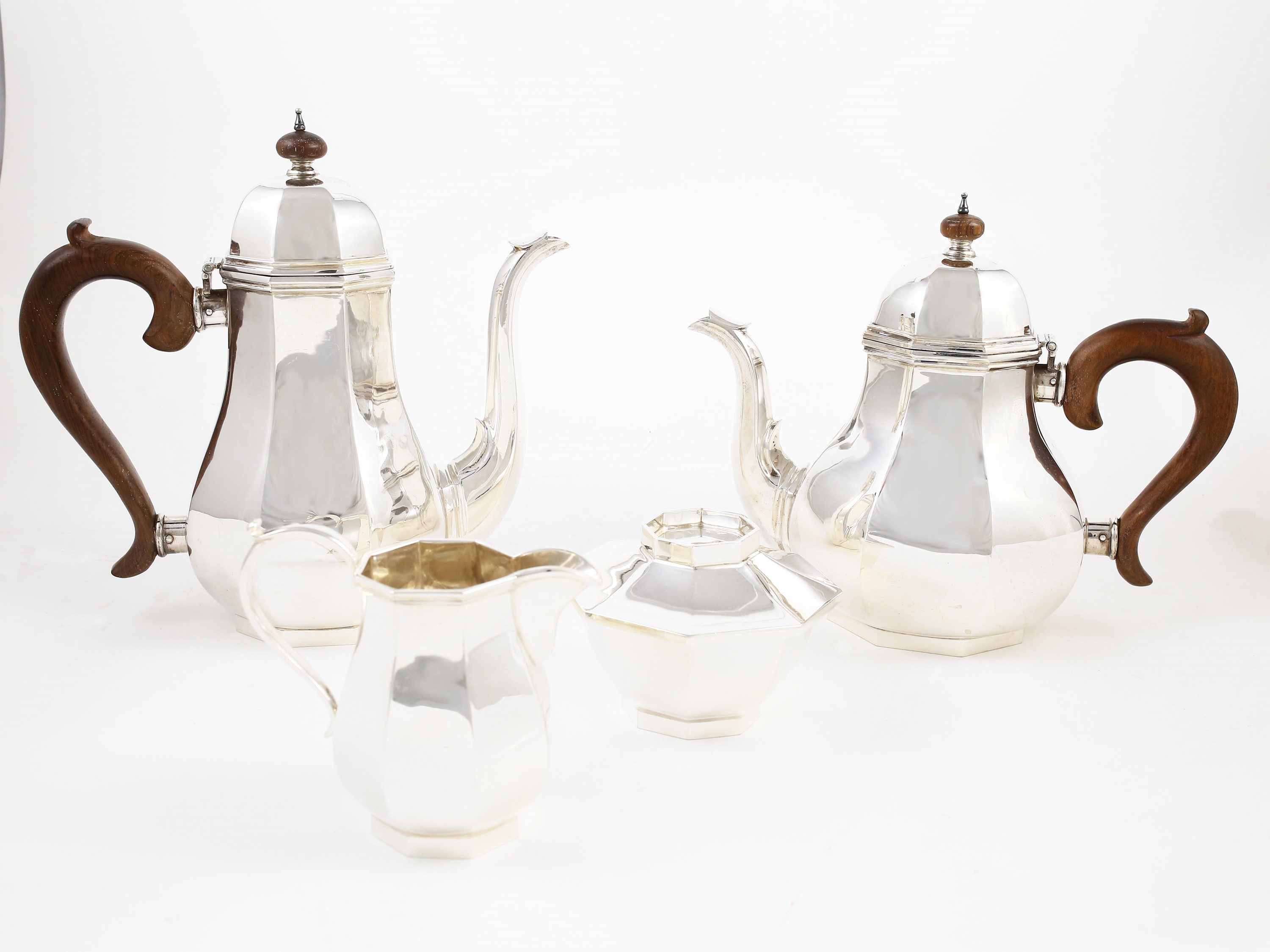 Anni Cinquanta composto da teiera, caffettiera, lattiera e zuccheriera, corpo ottagonale, prese in legno