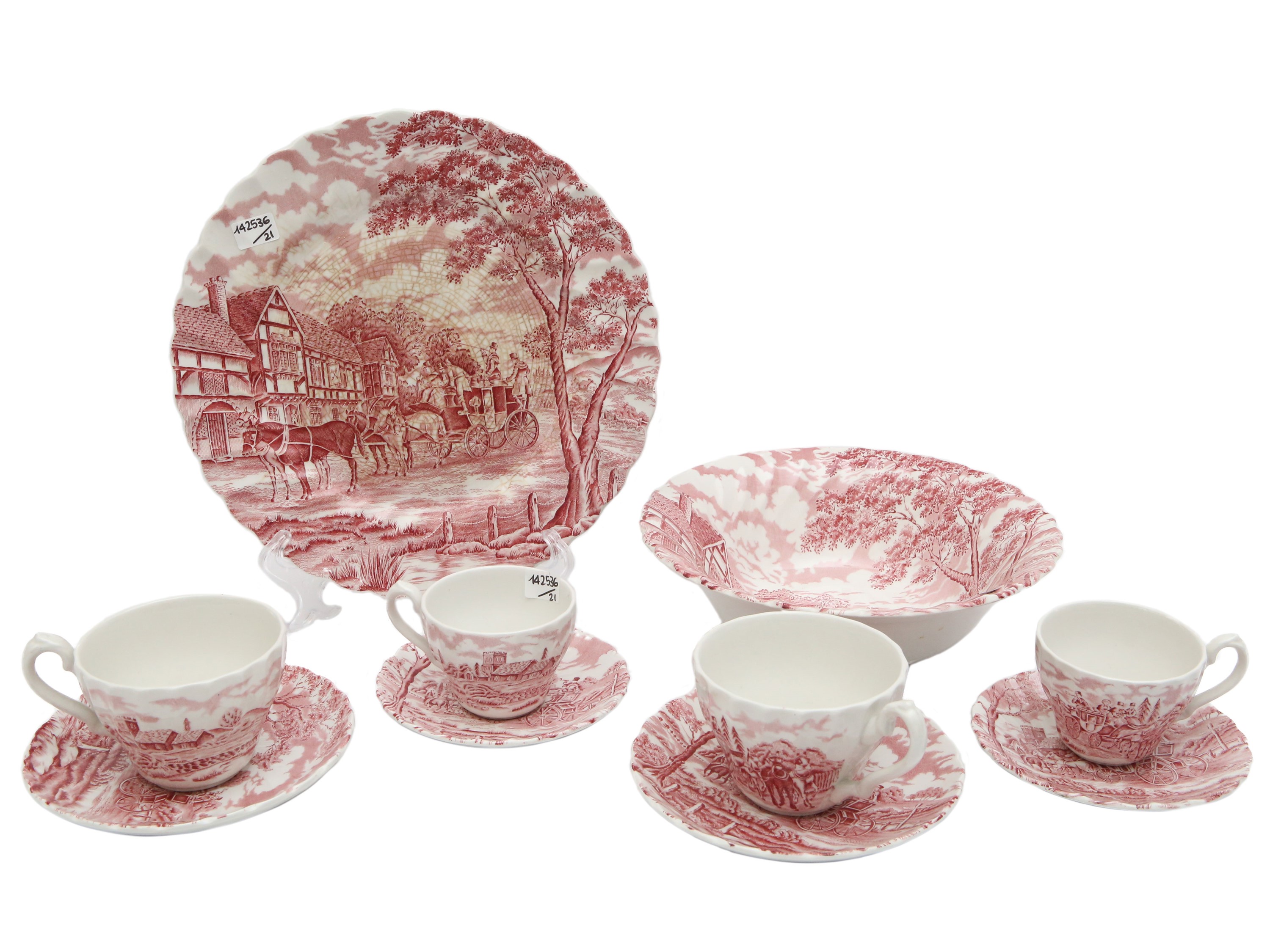 Inghilterra decorato a paesaggi in monocromia rosa, composto da 12 tazzine da caffe, 6 da te, una ciotola ed un vassoio circolare (21)