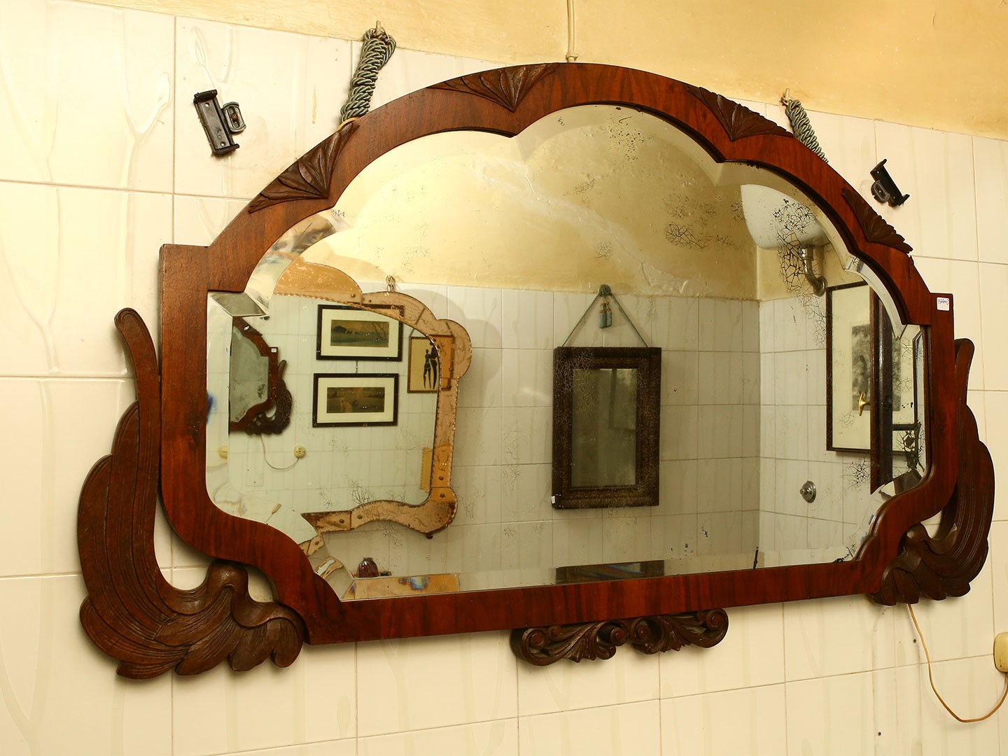 Francia, inizio del XX secolo di forma centinata sagomata, base intagliata con ali stilizzate, specchio molato a formare un motivo a smerlo, ossidazioni dello specchio