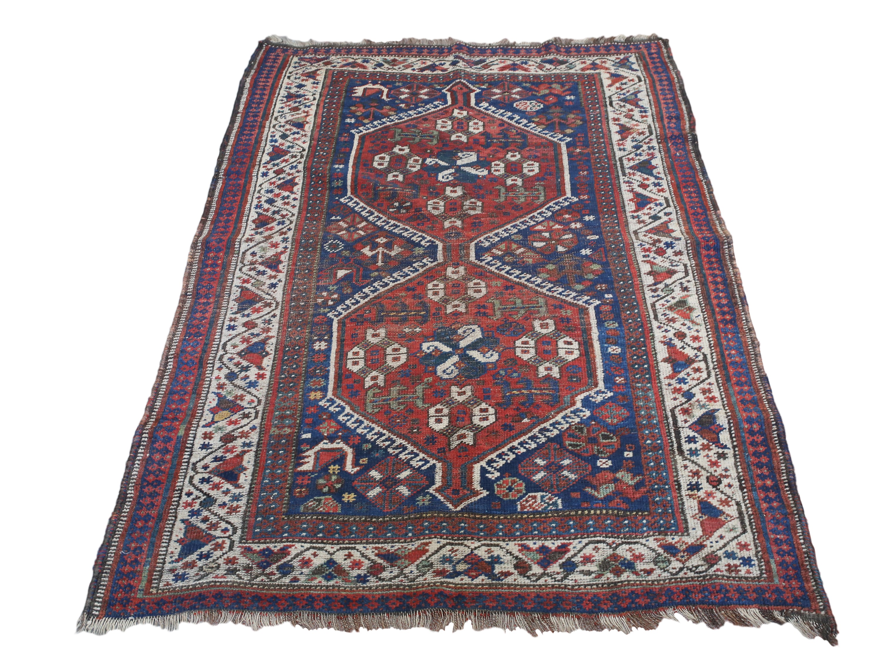 decorato con losanghe e motivi geometrici nei toni del rosso, blu e bianco, difetti