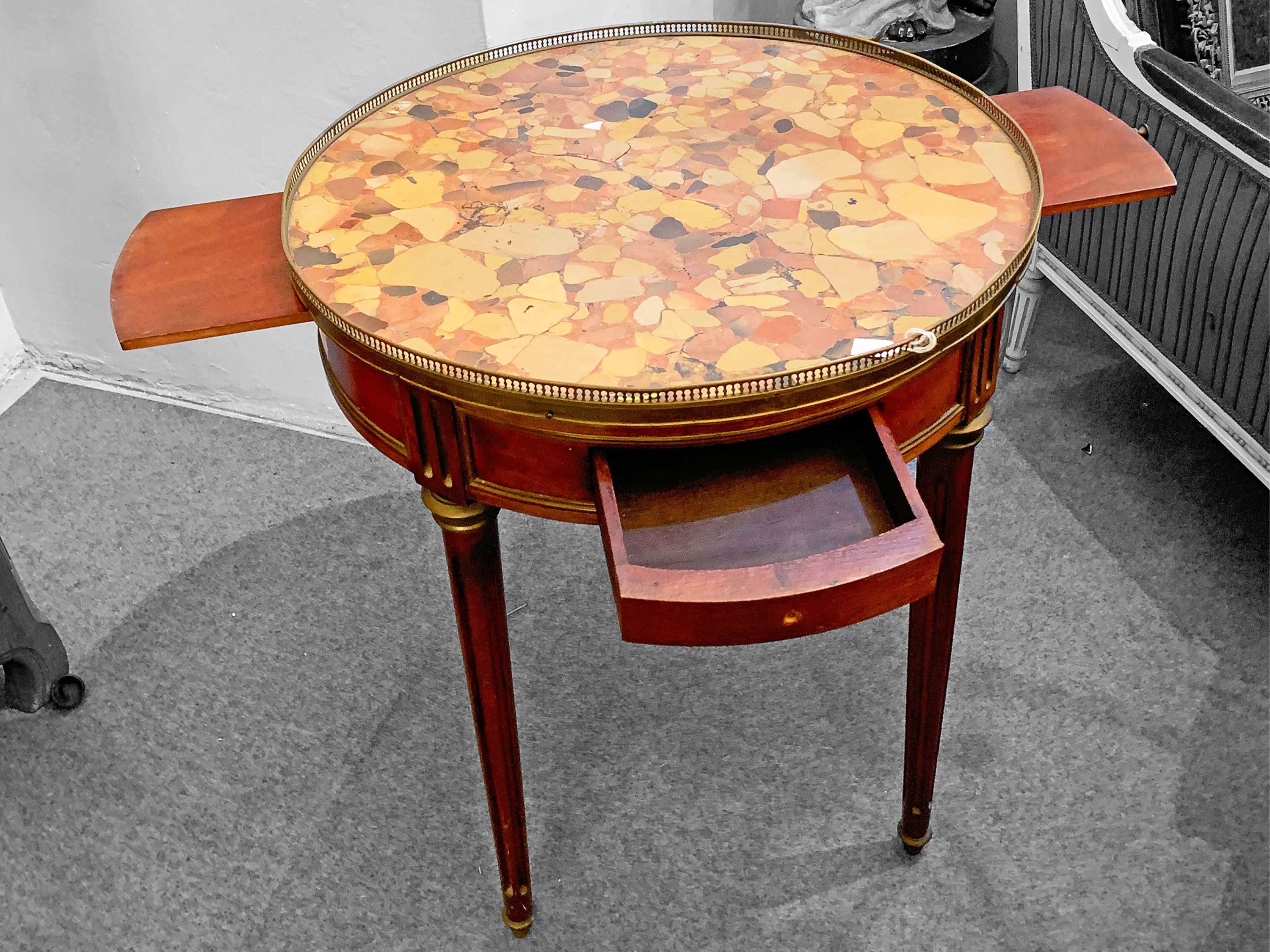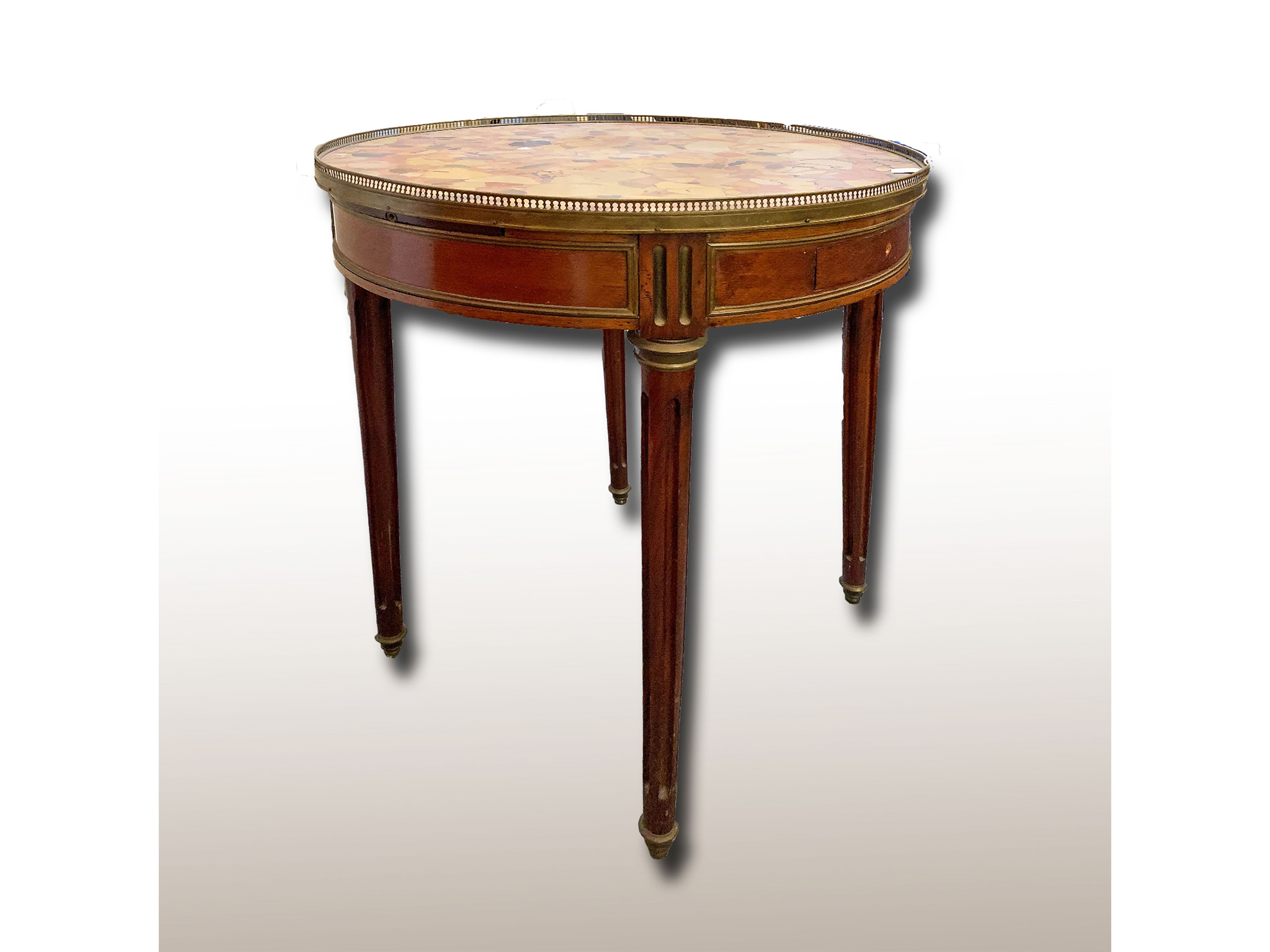fine del XIX/inizio del XX secolo piano in marmo breccia con bordo a ringhiera, dettagli in ottone, due pianetti estraibili ed un cassettino nella fascia, gambe scanalate