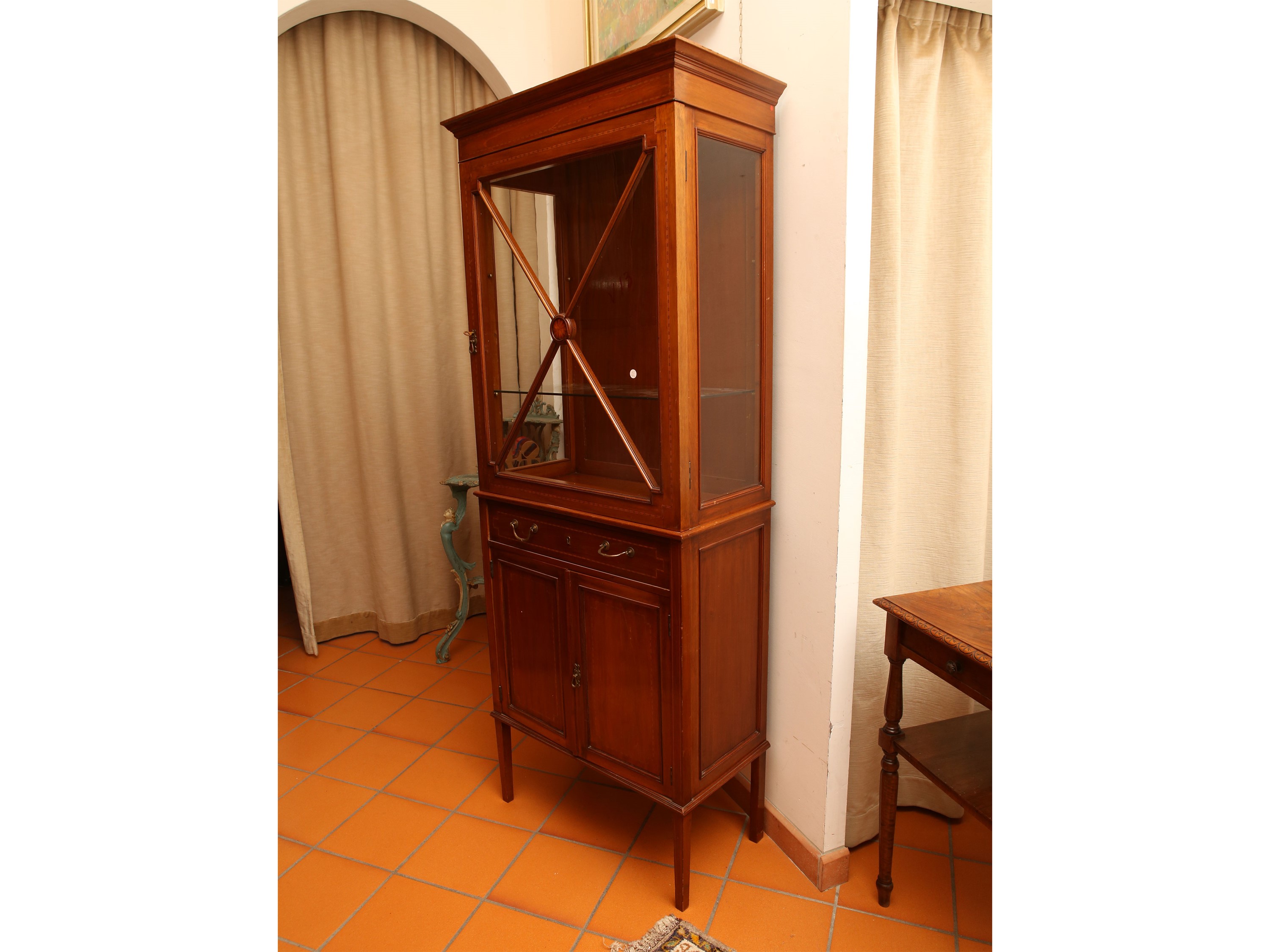 Inghilterra, seconda metà del XIX secolo parte superiore con sportello montato a vetro, un cassetto a tutto corpo nella fascia, doppio sportello sottostante impreziosito da sottile intarsio a scacchiera, lievi difetti