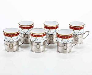Lotto misto di sei diverse tazze con quattro piattini e una lattiera, XX secolo