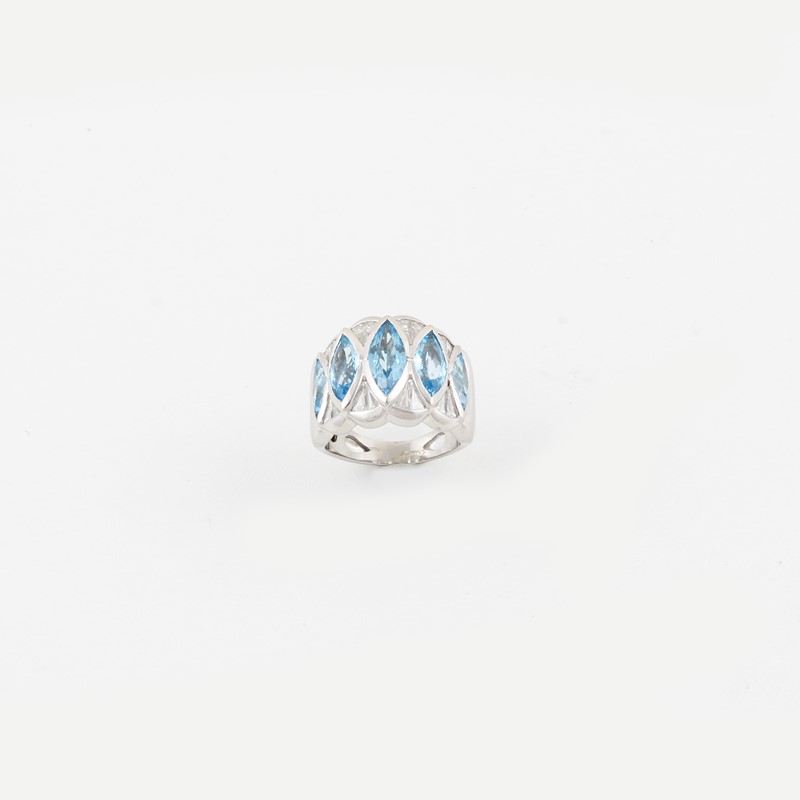 in oro bianco a fascia smerlata con cinque topazi azzurri taglio navette allineati evidenziati da diamanti, gr. 15,3. Misura 15 Firmato: Chantecler