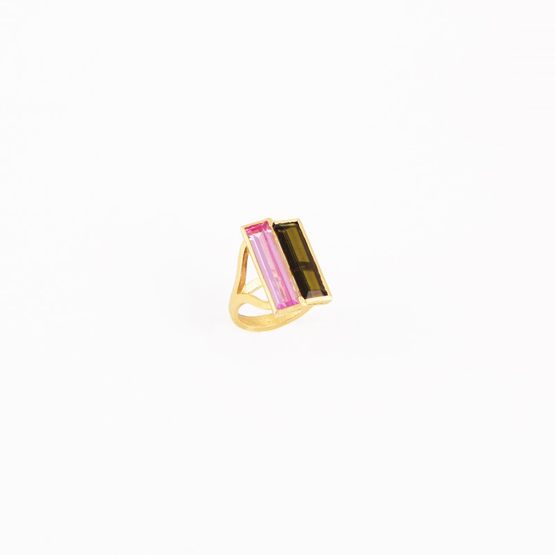 in oro giallo con tormaline rosa e verde taglio baguette, gr. 8,6. Misura 14