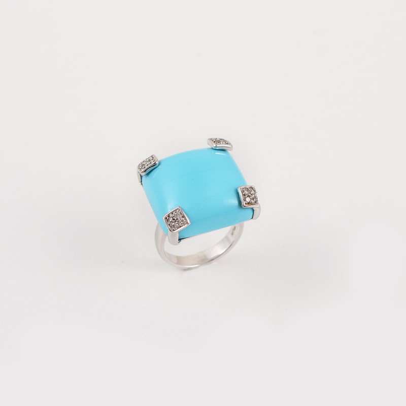 in oro bianco con brillanti e pasta di turchese, gr. 13,7. Misura 13