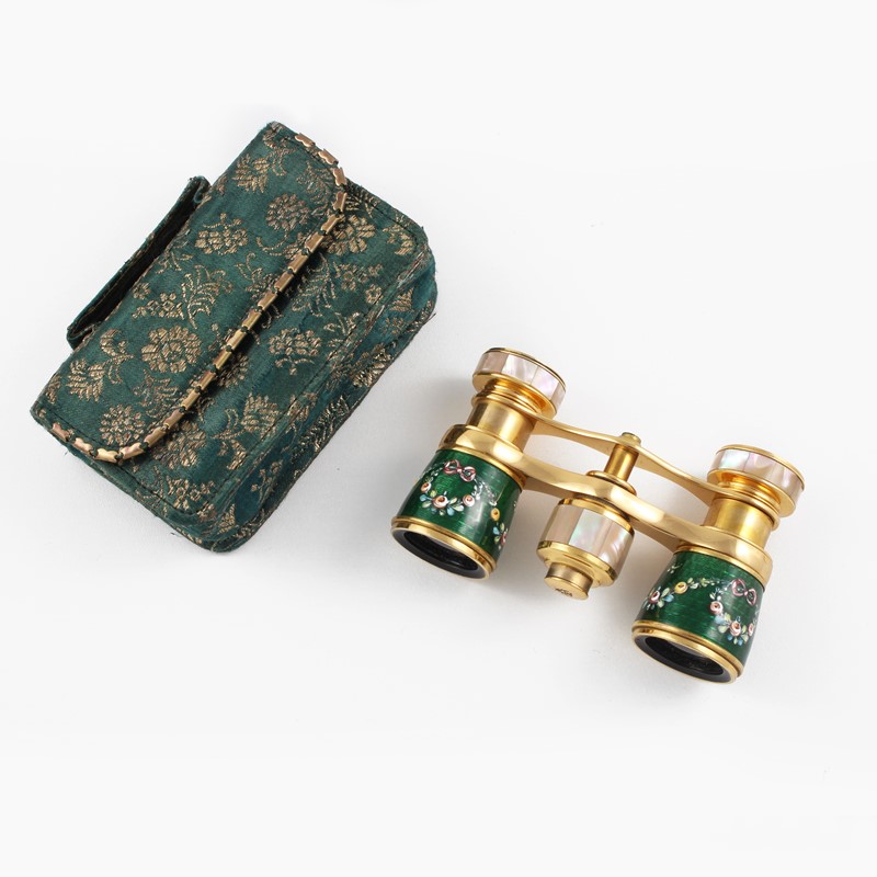 in metallo dorato, smalto verde e inserti in madreperla ornato da ghirlande fiorite e nodi d’amore in smalti policromi. Corredato da custodia originale a guisa di borsetta in seta verde con fiori e motivi vegetali in fili dorati. Firmato: Lemaire Paris