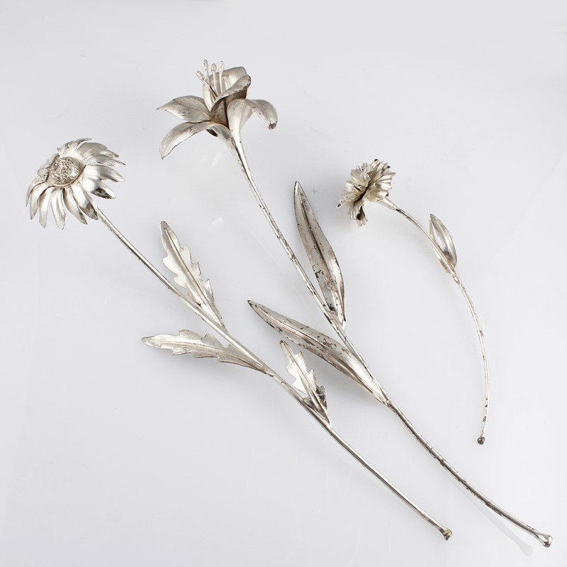 in argento 925, riproduzione di giglio, margherita e “anemone”, gr. 240 ca. Numerario 615 FI Firmato: Lisi – (Ditta Lisi fratelli & figli SNC – Firenze)