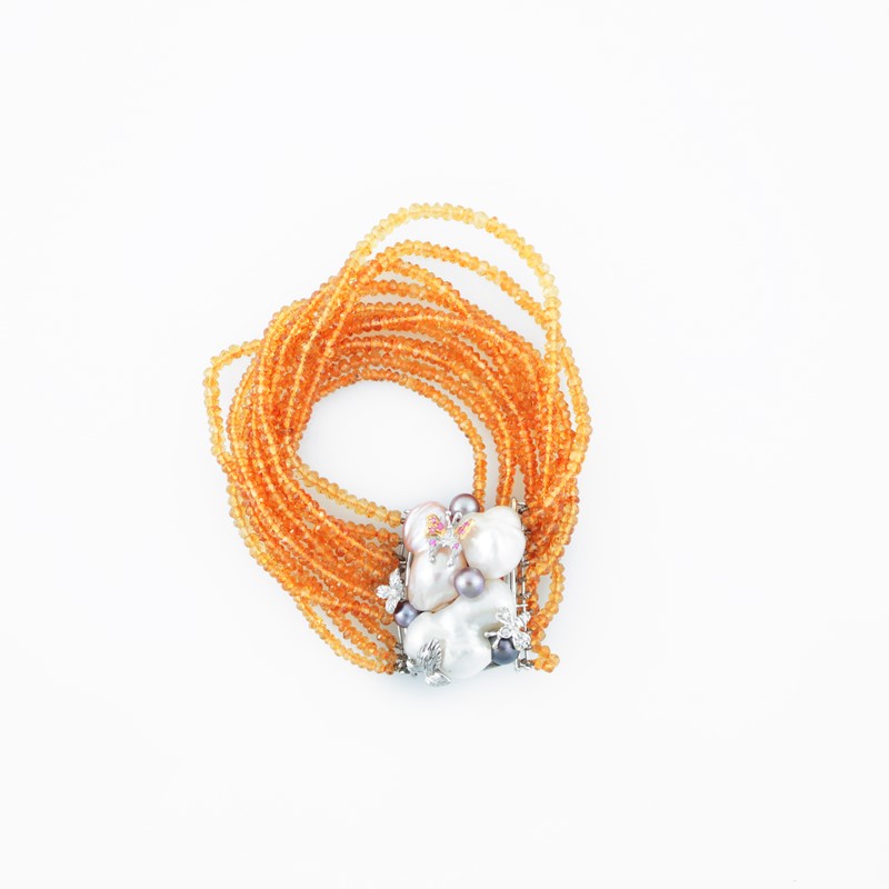 a undici fili di quarzo sfaccettato con chiusura in oro bianco, ornata da perle scaramazze e motivi vegetali, gr. 46 ca.
