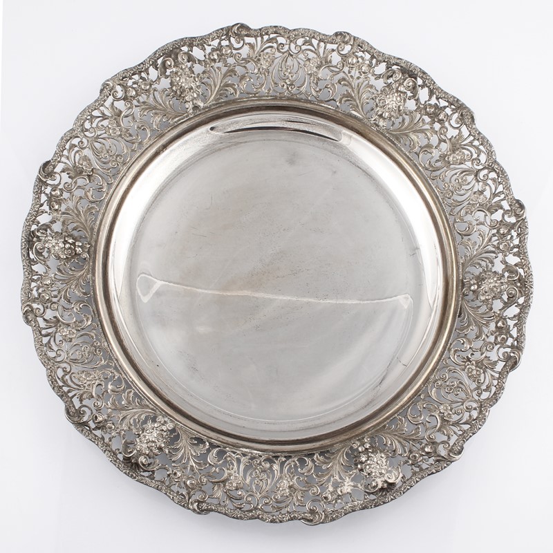 in argento 800 a forma circolare, con bordo inciso e traforato a motivi vegetali, gr. 640 ca. Diametro 33 cm Numerario “87 PD” Manifattura Italiana