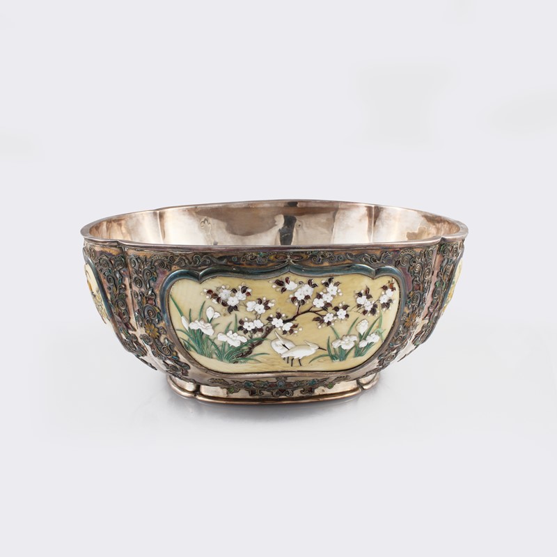 in argento a titolo alto, corpo ovale lobato, bordo alto decorato con volute a soggetto floreale e smalti policromi, riquadri con rami di pesco fioriti in madreperla bianca e colorata, rami di bambou, uccellini e animali di varie specie, gr. 810 ca. Dimensioni 22x19,50 h 8,30 cm