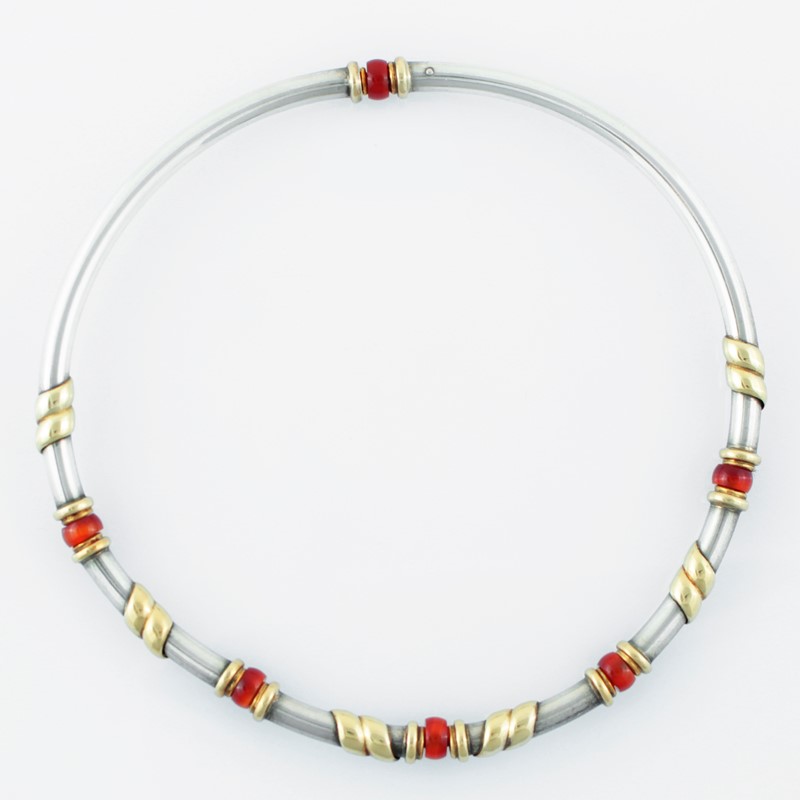 in argento, oro giallo e calcedonio rosso, gr. 58,5.