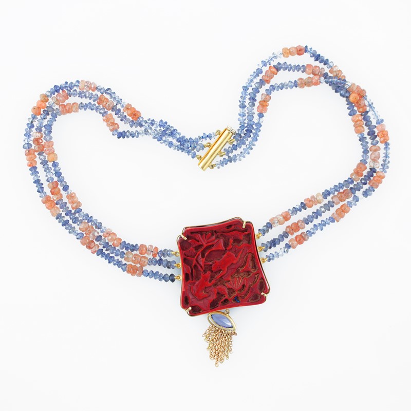 a girocollo a tre fili con rondelle di quarzi, tanzaniti sfaccettate e placca in lacca cinese, montate su oro giallo, gr. 59 ca.