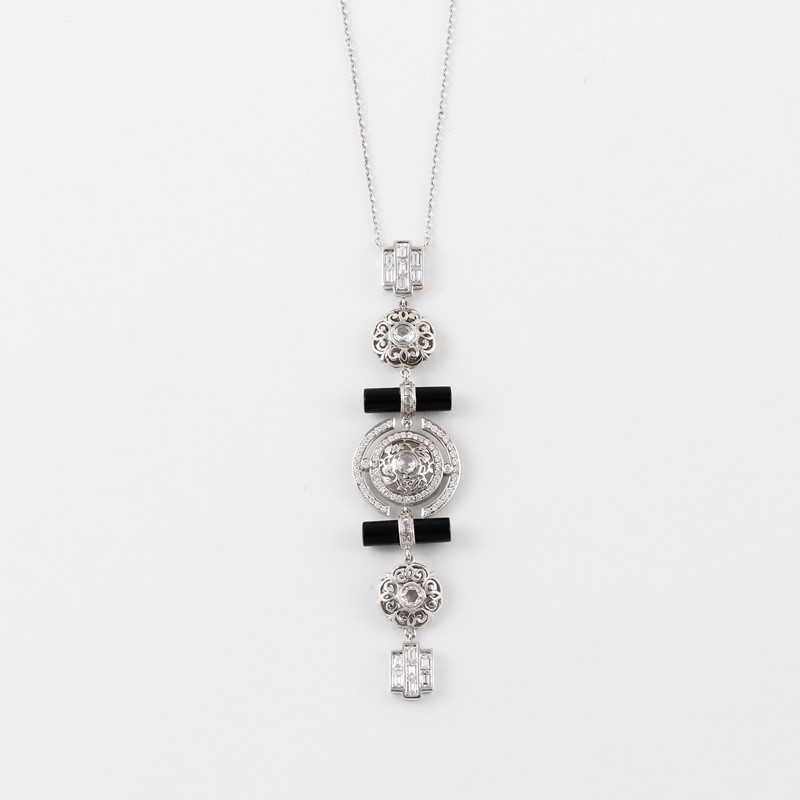 in oro bianco con pendente a forme varie alternate a rosoni con diamanti e cilindri in onice, diamanti del peso complessivo di 2,40 ct ca., gr. 20,6. Lunghezza 40 cm