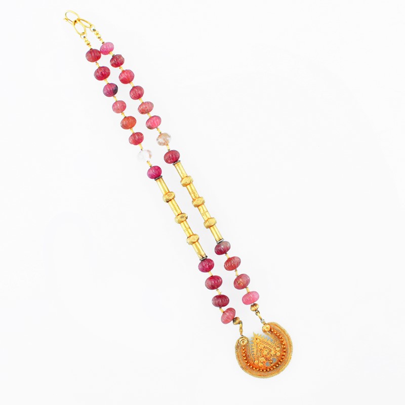 di gusto orientale in oro giallo con rondelle incise di tormalina rosa, gr. 76,3. Lunghezza 49 cm ca.