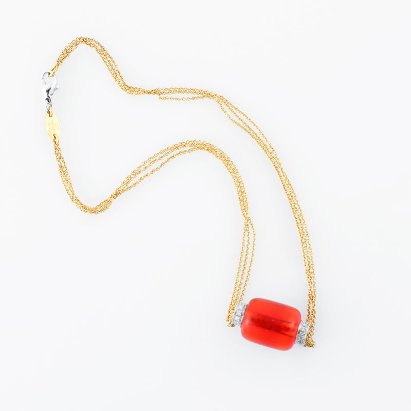 girocollo in oro giallo e bianco a catenelle con motivo cilindrico scorrevole in copale affiancato da rondelle in brillanti del peso complessivo di 0,30 ct ca., gr. 14,1. Lunghezza 38 cm Firmata: Loris Abate