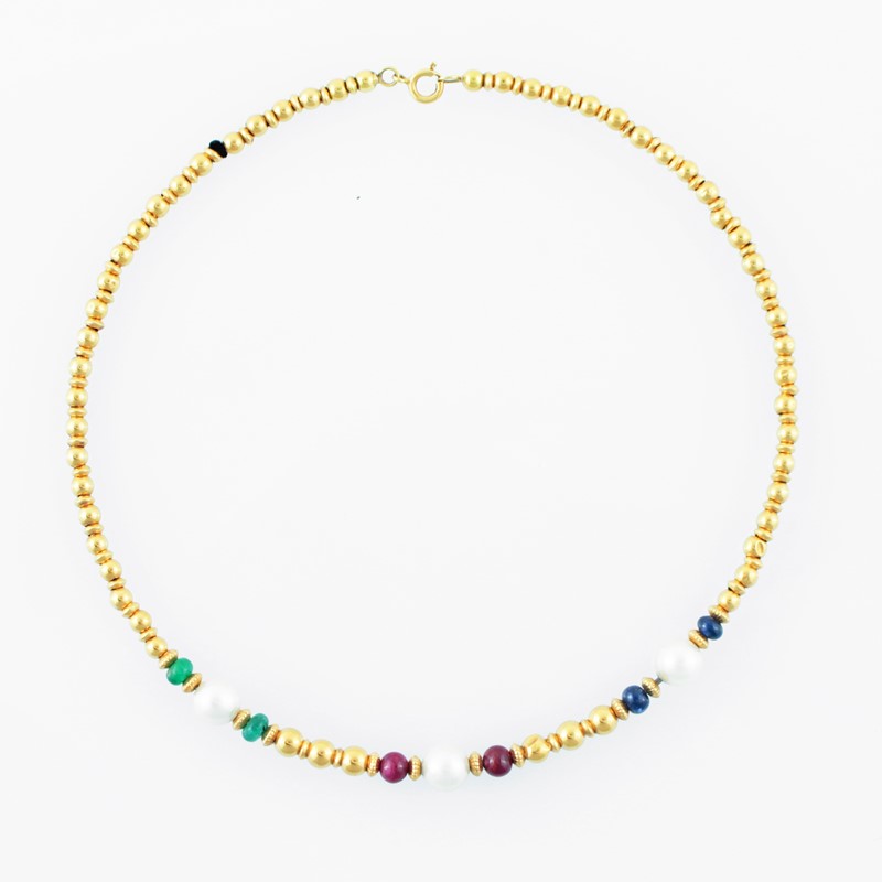 a girocollo in oro giallo con perle, smeraldi, zaffiri e rubini, gr. 14,1.