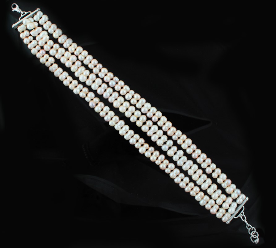 a tre fili di perle scaramazze di acqua dolce con montatura e chiusura in oro bianco. Lunghezza 32 cm (regolabile)