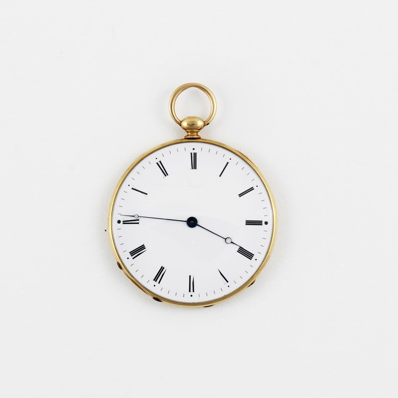 Orologio da tasca, ultra piatto, in oro giallo 18K, cassa con decorazioni floreali. Quadrante danneggiato. Realizzato nel 1850 circa Diametro: 45 mm Gr: 41